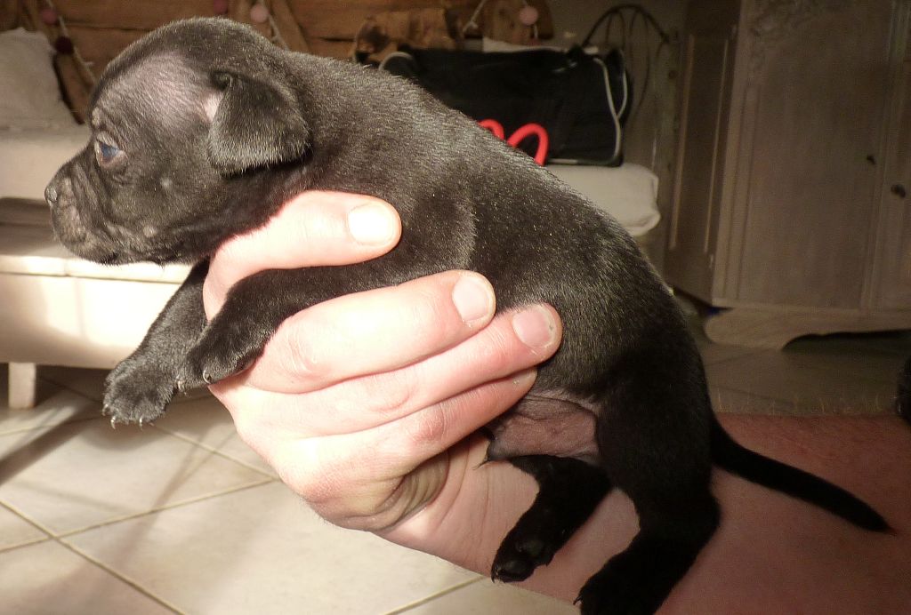 Petit mâle noir intense avec une petite tâche blanche au poitrail et sous le cou (peut apparaître quelques bringures en grandissant)