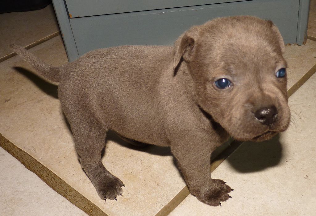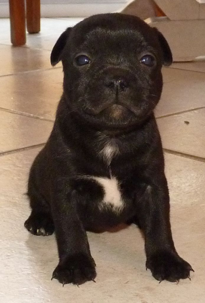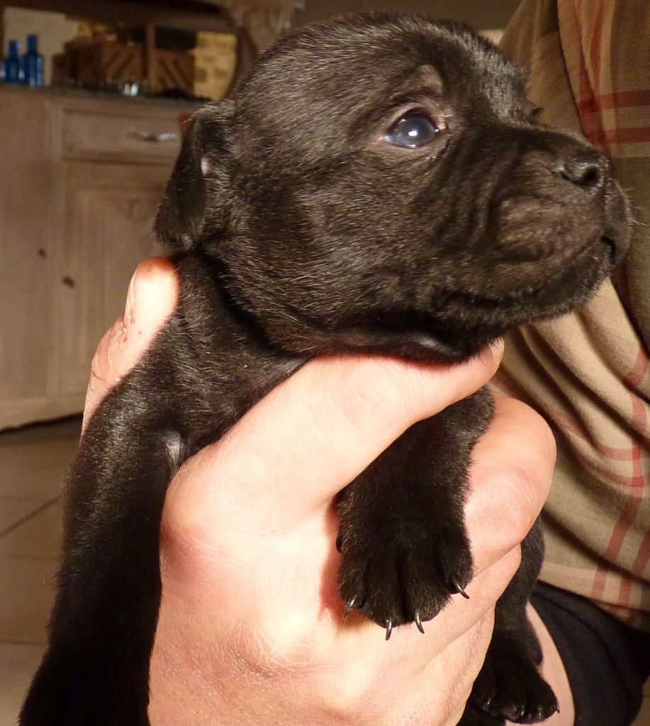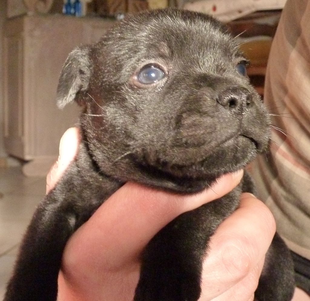 Petit mâle noir intense (peut apparaître quelques bringures en grandissant) N'BLACKY a un petit défaut d'incisive, qui ne cause aucun problème esthétique, ni de confort. Mais ne pouvant pas garantir sa confirmation, je le vends 900 EUROS N'BLACKY est le plus gros de la portée et ressemblera certainement à son papa. IL est court, compact et a une forte ossature. Si vous ne souhaitez pas faire de reproduction, N'BLACKY sera un staffie, très typé et le compagnon idéal de la famille. Joueur,curieux et très affectueux ...